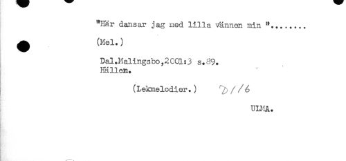 //// "Här dansar jag med lilla vännen min //// ^ (Mel.) //// Dal.Malingsbo,2001:3 s.89. //// Hällen. //// (Lekmelodier.) Y'. / 6 //// jt*;;'''- //// i //// UU-iÄ. ////