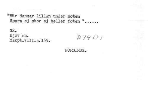 //// "Här dansar lillan under Roten //// Spara ej skor ej heller foten "...... //// Sk. //// Bjuv sn. 2> ? ; //// Mskpt.VIII.s.155. ' ' ^ //// NORD.MUS. ////