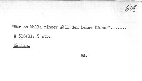//// "Här en källa rinner säll den henne finner"....... //// ' .... * * //// A 516:11. 5 Str. //// Källan. //// RA. ////