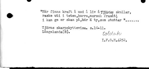 //// "Här finns kraft å nod å liv å T^orbRi skullar, //// I raske uti i teten,hurra,marsch framåt^ //// i kan ge er skam på,här ä tyysum stuttar //// Tjörns skarpskyttevisa. s. 10-11. //// Långelanda(B). ^ v.. ,, . //// I.F.G.H.4^52. //// Hr' ////