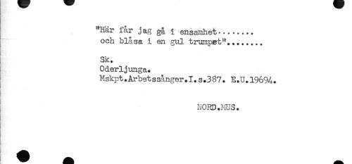 //// "Här får jag gå i ensamhet........ //// och blåsa i en gul trumpet'*........ //// Sk. //// Oderljunga. //// Mskpt.Arbetssånger.I. s.387. E.U. 19694-. //// NORD.MUS. ////