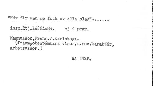 //// "Här får man se folk av alla slag"..............' //// insp.Rtj.H38A:89. ej i prgr. ^ //// Magnus son,Frans .V.Karlskoga. : //// (fragm^obestämbara visor,m.soc.karaktär, ! //// arbetsvisor.) ; //// < //// RA INSP. ' //// s ////