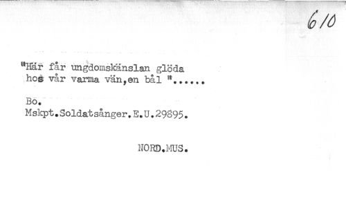//// "Här får ungdomskänslan glöda //// hes vår varma vän,en bål //// Bo. //// Mskpt.Soldatsånger.E.U.29895. //// NORD.MUS. ////