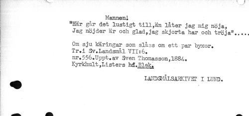 //// Manneni //// "Här går det lustigt till,än låter jag mig nöja, //// Jag nöjder är och glad,jag skjorta har och tröja'*... //// Om sju käringar som slåss om ett par byxor. //// Tr.i Sv.Landsmål VII:6. //// nr.556.Uppt.av Sven Thomasson,l884. //// Kyrkhult,Listers hd.Blek. //// t //// LåNDSMÅLSARKIVET I LUND. ////