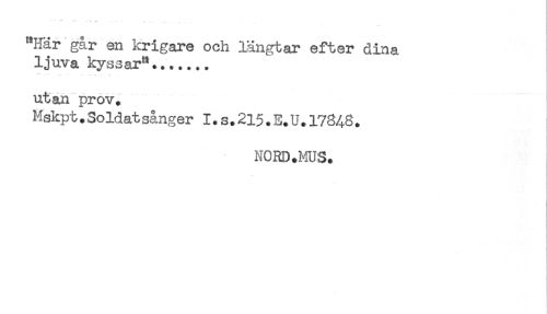 //// ** "' ** " --' ' -- - //// "Här går en krigare och längtar efter dina //// ljuva kyssar"....... //// < . //// - //// utan prov. //// Mskpt.Soldatsånger 1.s.215.E.U.17848. //// NORD.HUS. //// i ////