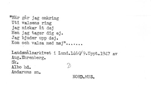 //// "Har går jag omkring //// Uti valsens ring //// jag nickar åt dej //// Men jag tager dig ej. //// Jag bjuder upp dej. //// Kom och valsa med mej"....... //// - -O- -- -.- . - //// Landsmålsarkivet i Lund.lA6(/9.Uppt*l%7 av //// Åug+Ehrenberg. //// Sk. //// Albo hd. ^ //// Andarums sn. //// NORD.MUS. ////