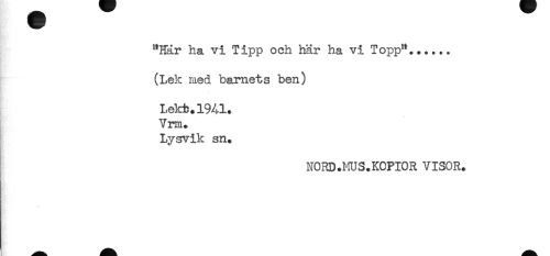//// "Här ha vi Tipp och här ha vi Topp"...... //// (Lek med barnets ben) //// Lekt.1941. //// Vrm. //// Lysvik sn. //// NORD.MUS.KCPIOR VISOR. ////
