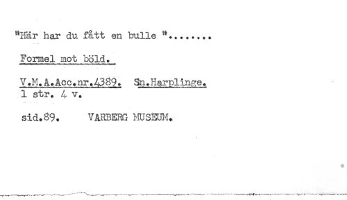 //// "Här har du fått en bulle //// Formel mot böld._ //// V.M.Acc.nr.4389. Sn.Harplin^e. //// 1 str. 4 v. //// sid. 89. VARBERG r-KJSEUM. //// e ////