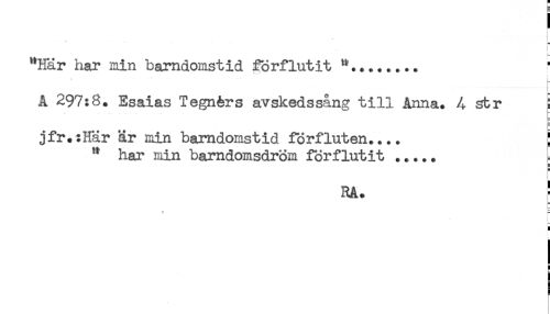 //// . .. . . . . . - [ //// } //// ! //// "Här har min barndomstid förflutit *...! //// t— //// A 297:8. Esaias Tegnérs avskedssång till Anna. 4 str ^ //// jfr.?Här är min barndomstid förfluten.... } //// " har min barndomsdröm förflutit ..... //// 5 //// RA. ! //// * r //// a //// ] ////