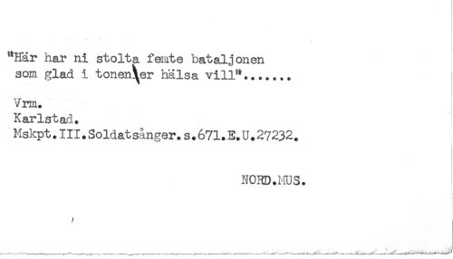 //// f //// I //// ! //// "Här har ni stolta femte bataljonen //// som glad i tonen^er hälsa vill"....... //// Vrm. //// Karlstad. //// Mskpt. III,Soldat sånger.s.671* E.U.27232, //// N03D.MUS. //// i //// : //// ) //// ). //// / ////