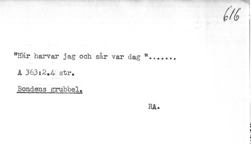 //// "Här harvar jag och sår var dag "... + ... //// A 363:2.4 str. //// Bondens grubbel. //// RA. //// H //// ! //// < //// b ////