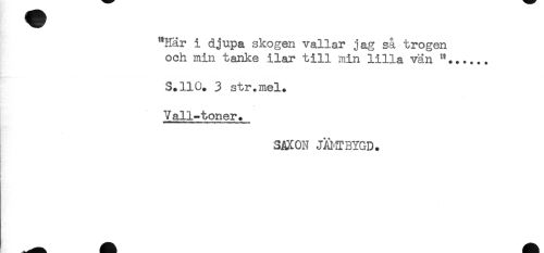 //// "Här i djupa skogen vallar jag så trogen //// och min tanke ilar till min lilla vän "*..... //// 3.110. 3 str.mel. //// Vall-toner. //// * //// 3AX0N JÄMTBYGD. //// . ////