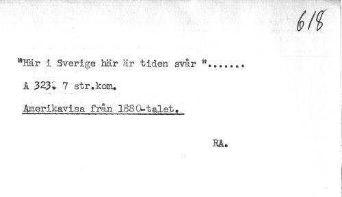 //// "Här i Sverige här är tiden svår ".+....* //// A 323^ 7 str.kom. //// Amerikavisa från l88&-talet. //// RÅ. //// ! ////
