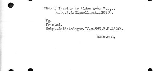 //// "Här i Sverige är tiden svår //// (uppt.K.Å.Rignell.omkr.1890). //// Vg. //// Fristad. //// Mskpt.Soldatsånger. IV. s. 559.E.U.282%. //// NORD.HUS. ////