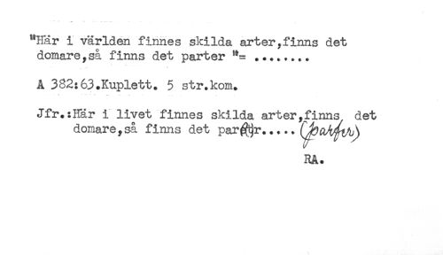 //// "Här i världen finnes skilda arter,finns det //// domare,så finns det parter **= ........ //// A 382:63.Kuplett. 5 str.kom. //// . ... . ... . ____ . //// Jfr.:Här i livet finnes skilda arter,finns det //// domare,så finns det par^r. //// RA. ////