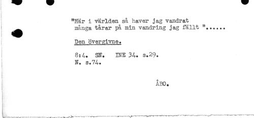 //// "Har i världen så haver jag vandrat //// ! ^ många tårar på min vandring jag fällt //// , Den övergivne. //// 8:4. SN. INE 34. s.29. //// N. s.74. //// < //// < //// ÅBO. //// __ ^ ^^ " - — ______ — — _^^ - — -------^ f-^-t^-t-.-.---^- —' ////