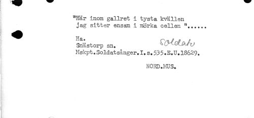//// "Här inom gallret i tysta kvällen //// jag sitter ensam i mörka cellen //// Snäst or p sn. ' ......^.-f-i.^ //// Hskpt.Soldatsånger.1.s. 53 5.E.U.18629. //// < //// ! //// N03D.HUS. //// t //// j //// ! ////
