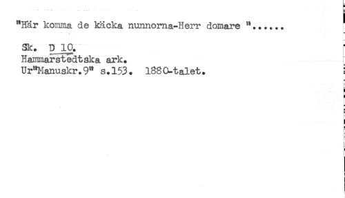 //// "Här komma de käcka nunnorna-Herr domare "...... //// .< * //// Sk. D 10. [ //// Hammarstedtska ark. //// Ur"Hanuskr.9" s.153. 1880-talet. ! //// C //// H //// e //// < //// i //// t ////