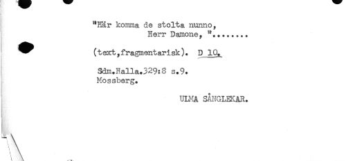 //// "Här komma de stolta nunno, //// HerrDamone? //// ^ ^^ (text,fragmentarisk). D 10, //// 3dm.Halla.329:8 s.9. //// Mossberg. //// UmA ^NGLEtåR. //// ^ \ ////