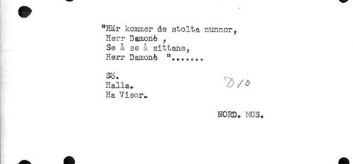 //// "Här kommer de stolta nunnor. //// Herr Damoné , //// Se å se å sittane, //// Herr Damoné ^....... //// SÖ. ' //// Halla. //// Ha Visor^ //// NORD. MUS. ////