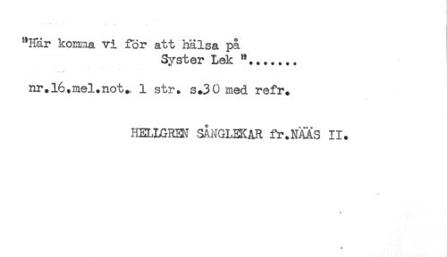 //// "Här komma vi för att hälsa på //// Syster Lek "....... //// nr. 16.mel.not., 1 str. s.30 med refr. //// HELLGREK SÅNGLEKAR fr.NAAS II. //// t ////