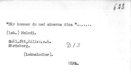 //// "Här kommer du med sönerna dina //// (lek.) Melodi. //// i //// Smal. Jät,2411:2.s.6. //// Strömberg. //// (Lekmelodier). //// ULMA. ////
