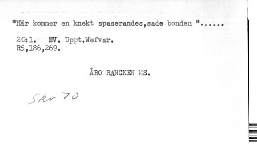 //// -- " ....... . - - - - - ...... ' ---- //// "Här kommer en knekt spaserandes,sade bonden "...... //// 20:1. UV. UDpt.Wefvar. //// R5,186,269. //// ABO RANCKEM MS. ////