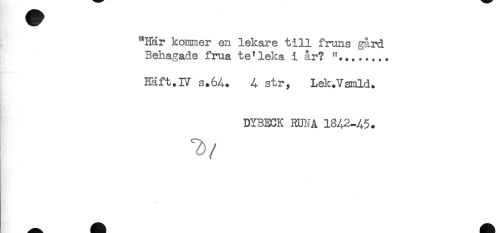 //// "Här kommer en lekare till fruns gård //// Behagade frua te'leka i år? "........ //// Häft.IV s.64. 4 str, Lek.Vsmld. //// DYBECK RUNA 1842-45. ////