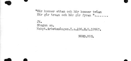 //// "Här kommer ettan och här kommer tvåan //// Här går trean och här går fyran "........ //// Jä. //// Stugun sn. //// Mskpt.Arbetssånger.I.S.&98.E.U.19967. //// NORD.MUS. ////