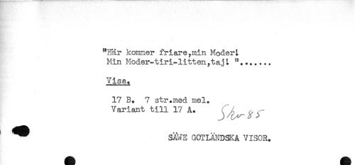 //// "Här kommer friare,min ModerL //// Min Moder-tiri-litten,taj t "....... //// Visa. //// 17 B. 7 str.med mel. //// Variant till 17 A. ^ //// ' ^^ SÄWE GOTIANDSKA VISOR. ////