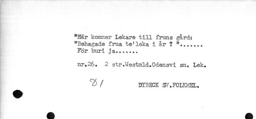 //// "Här kommer Lekare till fruns gård: //// "Behagade frua te'leka i år ? //// För buri ja....... //// nr.26. 2 str.Hestmld.Odensvi sn. Lek. //// ^ / DYBECK SV.FOLE^IEL. //// § ^ ////