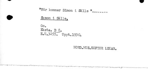 //// "Här kommer Simon i Sälle //// ^ S^on i Sälle. //// Go. //// Eksta* D 8. //// E.U.3255. Uppt.1930. //// NORD.MUS.KOPIOR LEKAR. //// -----^-J'-"V ------_----^ ////