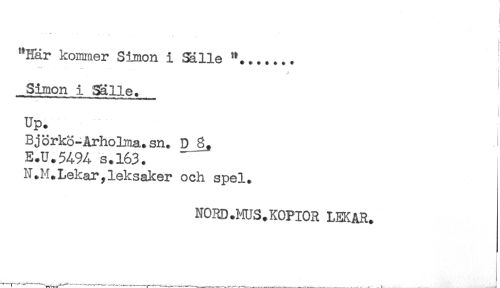 //// "Här kommer Simon i Sälle "....... //// Simon i Sälle. //// Up. //// Björko-Arholma.sn. DS, //// E.U.54% s.163. //// N.M.Lekaryleksalcer och spel. //// NORD.MUS.KOPIOR LEKAR. ////