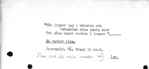 //// ' ^'' t A '.. ' ' -*.' i: ' .' //// t^Hå t* //// ! "Här ligger jag i ränsten och //// I betraktar mina gamla skor //// Tvi såna hasor rocken i trasor //// . //// En vackerjvisa^ //// 3:oregelb. VA. Brage 14 nr. //// ^^ ^^ ^ ABO. ////