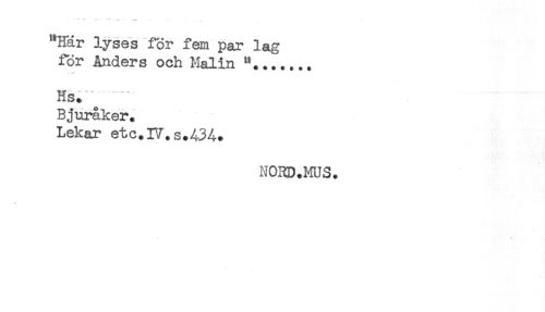 //// "Här lyses for fem par lag //// för Anders och Malin "*...... //// . — //// ' — T. V - ... y. .- . . .. //// Hs. //// Bjuraker. //// Lekar etc.IV.s.434. //// NOKD.MUS. //// * ////
