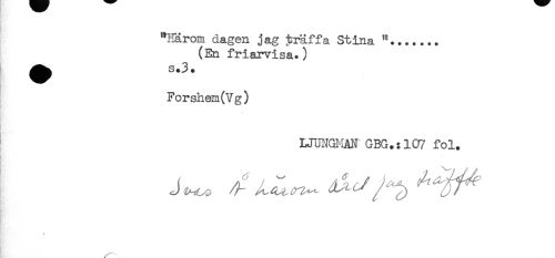 //// "Härom dagen jag träffa Stina "....... //// (En friarvisa.) //// ^^ s.3. //// Forshem(Vg) //// UUNGilAN GBG.:107 fol. //// < //// g' ////