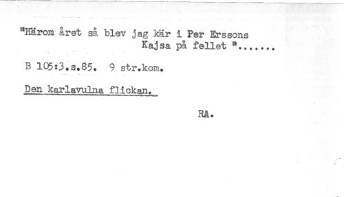 //// "Härom året så blev jag kär i Per Erssons //// Kajsa på fellet "....... //// B 105:3.s.85. 9 str.kom. //// r- - .. //// Den karlavulna flickan. //// Rå. ////