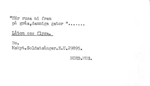 //// "Har rusa ni fram //// på gråa,dammiga gator "....... //// Låtom oss flyga. //// Bo. //// Mskpt.Soldatsånger.E.U.29895. //// NORD.HUS. ////