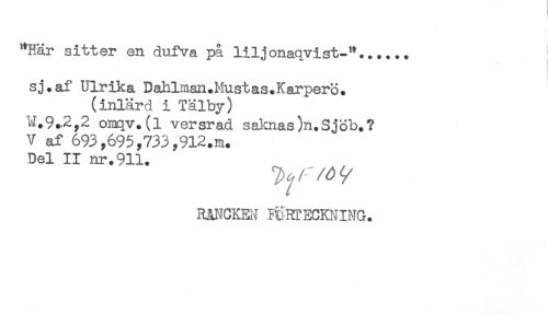 //// "Här sitter en dufva på liljonaqvist-*...... //// sj.af Ulrika Dahlaan.Mustas.Karperö. //// (inlärd i Tälby) //// W.9.2,2 o!aqv. (1 versrad saknas)n.Sjob.? //// V af 693,695,733,9l2.m. //// Del 11 nr.911. //// RANCKEN ^RTECIQJING. ////