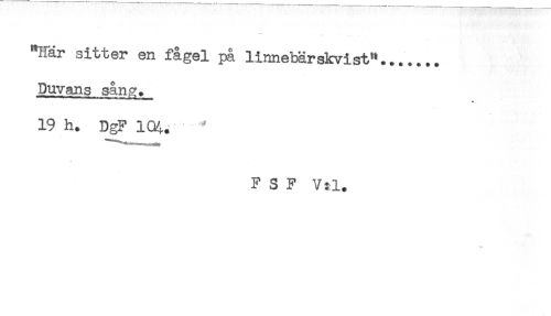 //// "Här sitter en fågel på linnebärskvist"....... //// Duvans sång. //// 19 h. DgF 1%. * //// * //// F S F V:!. ////