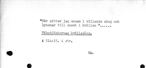 //// ! //// "när sitter jag ensam i villande skog och //// lyssnar till suset i kvällen //// ! Fäbodjäntomas kvällssång. //// g ***-*' //// A 51A:15. A str. ////