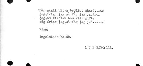 //// "Här skall bliva bröllop shart/bror //// jag,friar jag så får jag ja?tror //// jagyom flickan hon vill gifta //// sig friar jag,så får jag ja"...... //// Visa. //// Ingclstads hd.Sk. //// ! //// L U F 34^0:111. //// T ////