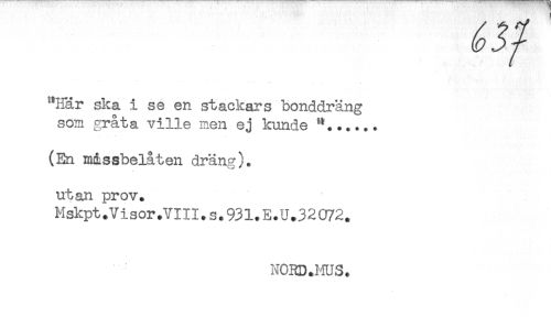 //// "Här ska i se en stackars bonddräng //// som gråta ville men ej kunde //// (En missbelåten dräng). //// utan prov. //// Mskpt.Visor.VIII.s.93l.E.U.3 2 072. //// NORD.MUS. ////