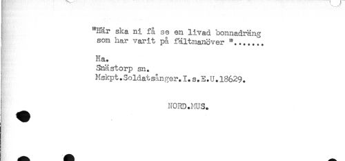 //// "Bär ska ni få se en livad bonnadräng //// som har varit på fältmanöver //// Ha. //// Snästorp sn. //// Mskpt.Soldat sån ger.I.s.E.U.18629. //// } NORD.MUS. ////