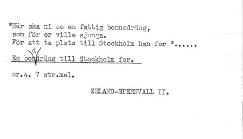 //// "Här ska ni se en fattig bonnedräng, //// som for er ville sjunga. //// För att ta plats till Stockholm han for "...... //// En boMräng till Stockholm for.__ //// i //// ) //// ) //// nr.4. 7 str.mel. i //// ! //// ! //// ZELAI^-STEINVALL II. //// i //// t //// < ////