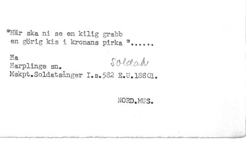 //// ! //// f //// L //// f //// "Här ska ni se en kilig grabb //// en görig kis i kronans pirka "...... //// Harplinge sn. //// Mskpt.Soldatsånger I.s.582 E.U.18801. //// NORD.MUS. ////