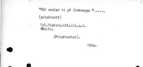 //// "Här spelar vi på lieknagga ..... //// w //// i (polsktext?) //// i //// Vgl.Vistorp.LLL:A5A.s.2. //// Svalin. //// i //// w //// } //// (Polsktexter). //// un^iA. ////