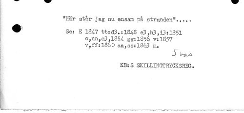 //// "Här står jag nu ensam på stranden"..... //// ^ Se: E 1847 tt:d3.:l8A8 e3,h3,i3:l351 //// j. o,nn,e3,l854 gg: 1856 v: 1857 //// v,ff:l860 aa,ss:l863 m. //// KB:S SKILLBIGT RYCKSREG. ////