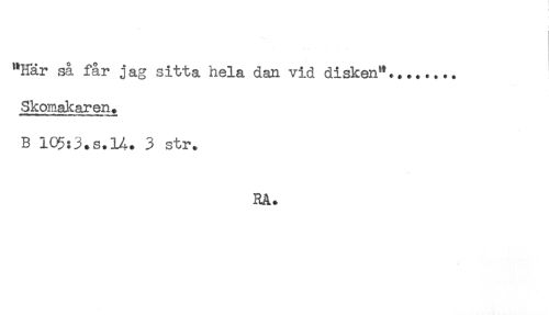 //// "Här så får j ag sitta hela dan vid disken"........ //// Skomakaren. //// B 105:3.s.14. 3 str. //// Rå. ////