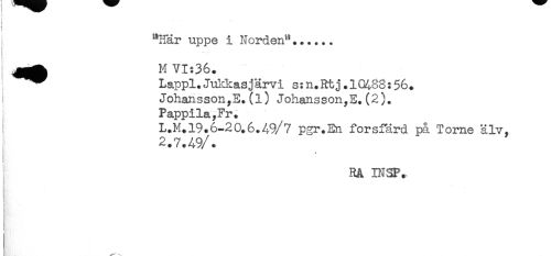 //// "Här uppe i Norden"...... //// ^^^ Lappl.JuItkasjärvi s:n.Rtj.10488:56. //// Johansson, E.(1) Johans son, E.(2). //// Pappila,Fr. //// L.H.19.6-20.6.4^/7 pgr.En forsfärd på Torne älv, //// 2.7.49/* //// t //// RÅ INSP. ////